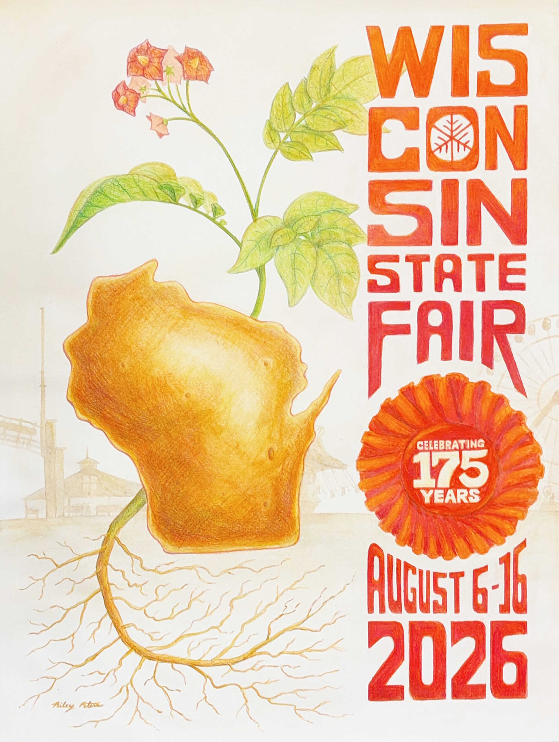 As the commemoration of the Competitive Exhibits 2026 theme, “Rooted in Tradition,” Peters’ piece overflows with warmth and nostalgia. The artwork depicts a colossal potato shaped like Wisconsin that is rooted in the traditions of agriculture, entertainment and memory making while spotlighting a beautifully rendered Wisconsin State Fair ribbon. As Wisconsin State Fair officials invite everyone to “Celebrate Together” for the 175th anniversary this year, Peters’ poster will offer Fairgoers a chance to bring home a piece of history.