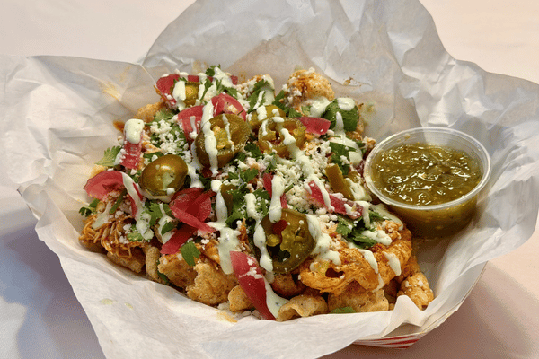 Tinga Tango Chicharrones is a dish created to be the ultimate sweet-heat showstopper. A savory stack of house–made crispy honey-habanero pork rinds topped with smoky chicken tinga, tangy pickled red onions, creamy queso fresco, cotija cheese, sweet and spicy candied jalapeños, and fresh cilantro. Finished with a drizzle of silky cilantro-lime crema and served with vibrant salsa verde for dipping, drizzling, and devouring.